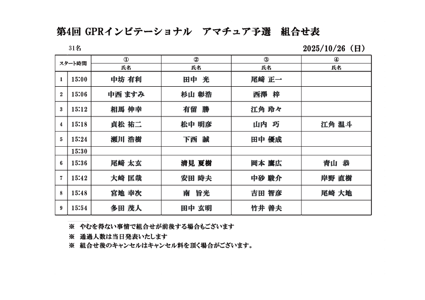 第4回GPR INVITATIONALアマチュア予選会3rd 組合せ