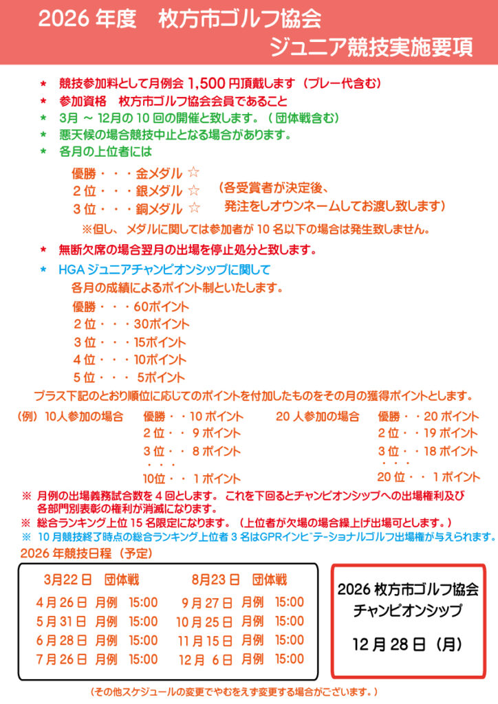 【参加資格】枚方市ゴルフ協会会員であること(対象:小学2年生〜高校3年生)